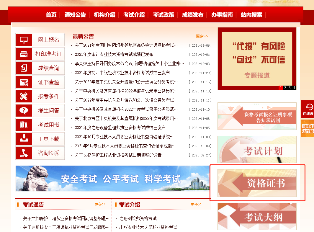 1、登陆中国人事考试网(http;://http://www.cpta.com.cn/),点击右侧“资格证书”